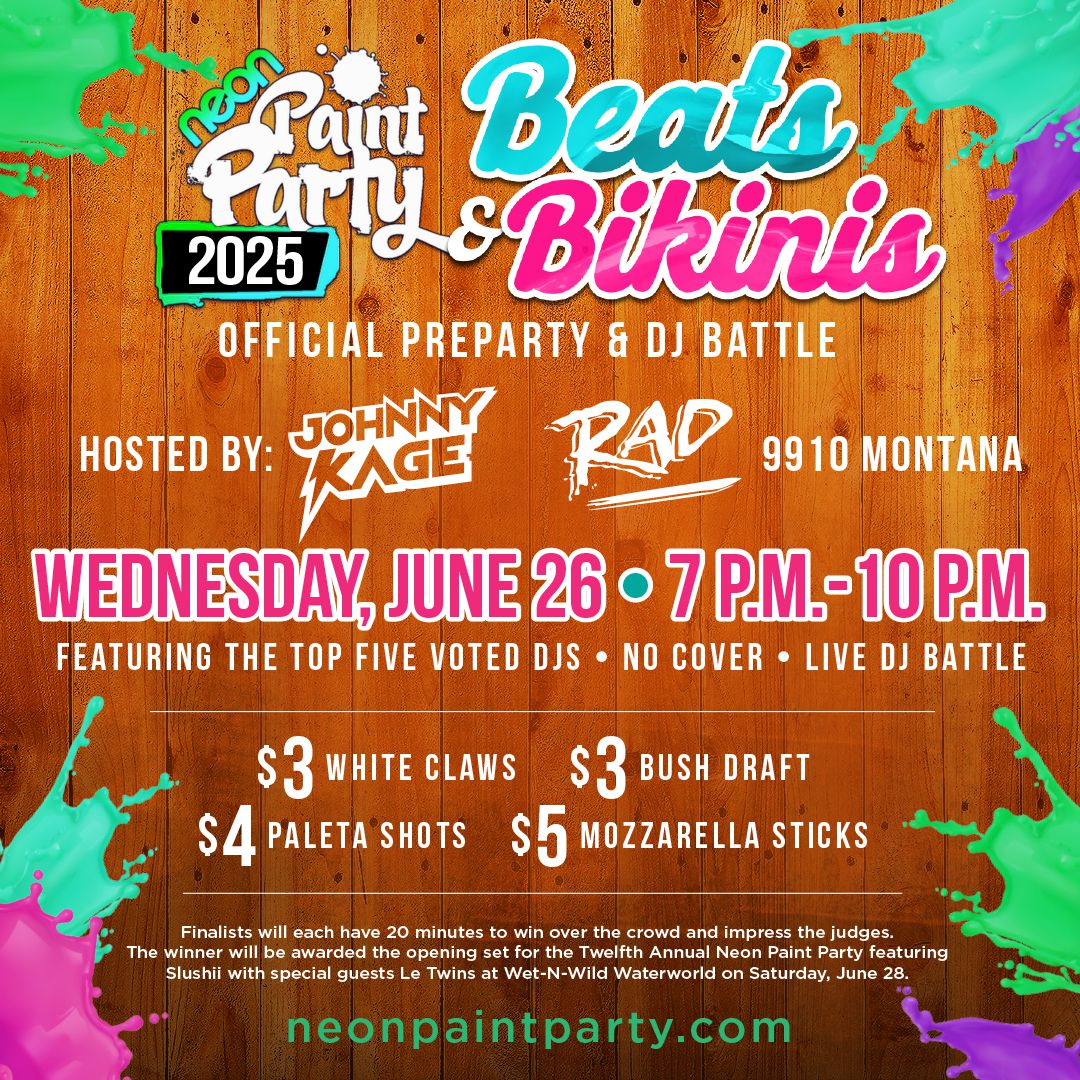 The Neon Paint Party presents the annual "Beats and Bikinis" DJ Battle (Date/Location to be announced). Details on how to enter coming soon! Hosted by Johnny Kage - the top five finalists will battle it out live in front of a crowd and a panel of judges only a few days before the festival; winner of the "Beats and Bikinis" event is awarded with the opening set of the 10th annual Neon Paint Party in El Paso, TX on Saturday, July 8th, 2023 at Wet N' Wild Waterworld.